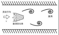 當(dāng)管道中流體介質(zhì)通過(guò)旋渦發(fā)生體(三角柱)時(shí),由于局部流速加速而產(chǎn)生旋渦現(xiàn)象(如圖一),此旋渦分成兩列交替地出現(xiàn),這種旋渦列被稱(chēng)為卡門(mén)渦街。